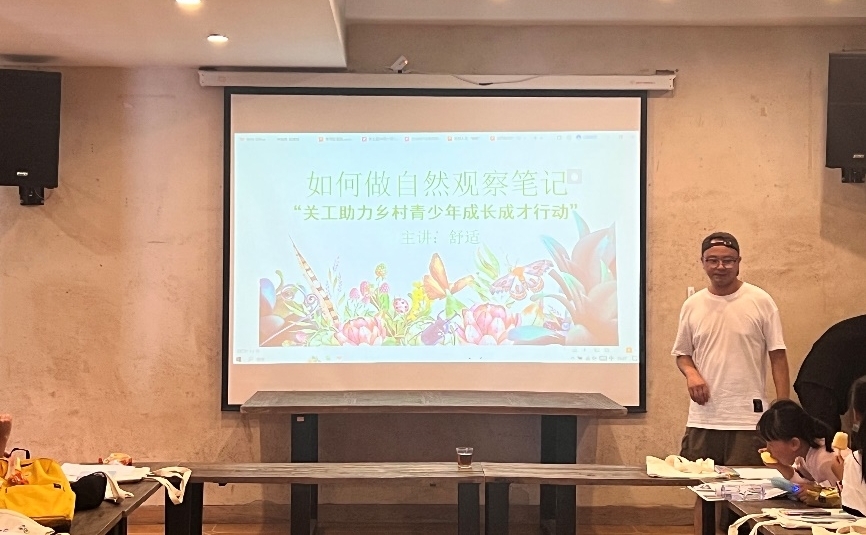 在自然观察活动结束后,老师和学生齐聚于全国第四批自然教育基地——向阳舍慢生活农场,围绕“如何观察”进行自然教育笔记的学习,包括自然笔记的前身、自然笔记的要素、自然笔记的四种方法、优秀作品的讲解,进一步提升青少年自然笔记绘制的能力。“我很喜欢天牛,我已经初步构思好了自然笔记的内容,未来几天我会去买一些天牛的标本和书籍,再结合实地观察,完成一份我的专属自然笔记。”课后,在老师的鼓励下,小朋友们对于自己的自然笔记都产生了自己的小火花。