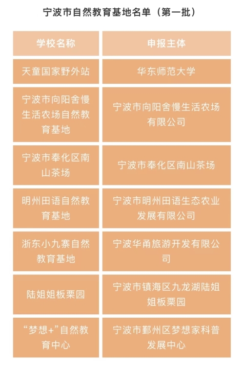 近日,宁波市林业园艺学会公布了第一批宁波市自然教育学校(基地)名单,其中宁波植物园、宁波市林场等8家单位获得“宁波市自然教育学校”称号,天童国家野外站、明州田语自然教育基地等7家单位获得“宁波市自然教育基地”称号。