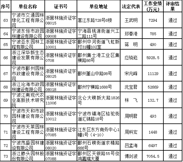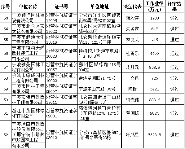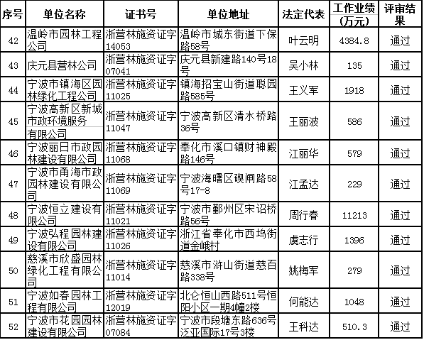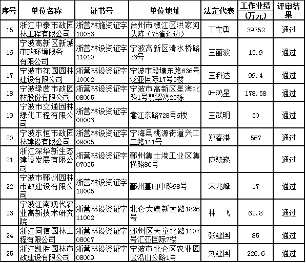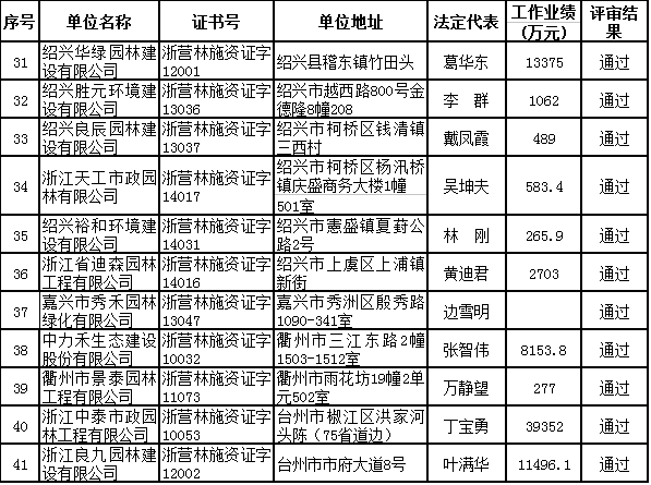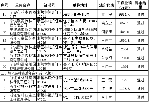 根据《浙江省绿化造林工程设计、施工和监理资质核定细则》文件精神,经专家评审,同意浙江省林科院园林绿化工程公司等90家单位的绿化造林资质施工乙级资质通过年审,同意浙江省林科院园林绿化工程公司等29家单位的绿化造林资质设计乙级资质通过年审。
