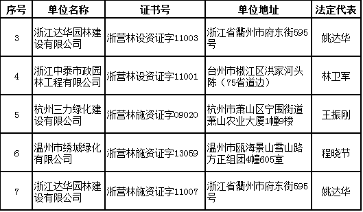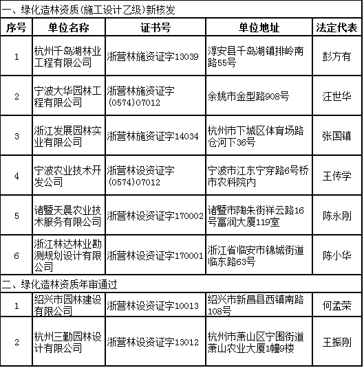 根据《浙江省绿化造林工程设计、施工和监理资质核定细则》文件精神,经专家评审,同意核发诸暨天晨农业技术服务有限公司等6家单位的绿化造林设计、施工乙级资质,同意绍兴市园林建设有限公司等7家单位通过绿化造林资质设计、施工乙级资质年审。