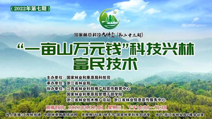 8月24日,由国家林草局科技司主办、浙江省林业局承办的第23期国家林草科技大讲堂在杭州举办。国家林草局科技司副司长(正司局级)王连志视频连线出席并讲话,省林业局党组成员、副局长诸葛承志出席主会场活动并致辞。
