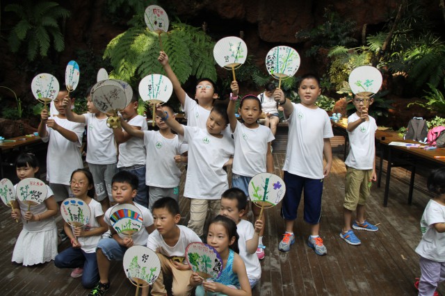 小朋友和自己的竹扇画合影留念